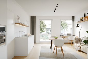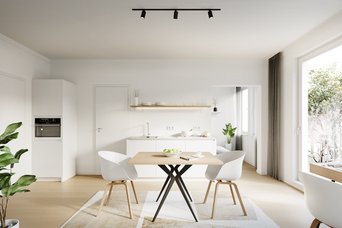 Ausstattung / Qualitäten: vollmöblierte Apartments in einem Gebäudekomplex des Mid Century-Stils, Fußbodenheizung, dezentrale Lüftung für angenehmes Raumklima, Badezimmer mit bodengleichen Duschen, barrierearm, Aufzug, großzügige Community-Zone sowie Innenhof mit hoher Aufenthaltsqualität, teilweise Balkone und Terrassen, eigenes Patio für jedes Townhouse